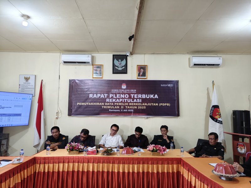 Rantepao, kab-torajautara.kpu.go.id- Rabu (02/07/2025), Komisi Pemilihan Umum Kabupaten Toraja Utara menggelar Rapat Pleno Rekapitulasi Pemutakhiran Data Pemilih Berkelanjutan Triwulan II Tahun 2025 di Aula Kantor KPU Kabupaten Toraja Utara yang dipimpin oleh Ketua KPU Kabupaten Toraja Utara, Jan Hery Pakan. Pemutakhiran Data Pemilih Berkelanjutan dilaksanakan berdasarkan Peraturan KPU Nomor 1 Tahun 2025 tentang Pemutakhiran Data Pemilih Berkelanjutan. Rapat Pleno dihadiri oleh Ketua dan Anggota Bawaslu Kabupaten Toraja Utara, Kasat Intel Polres Toraja Utara, Pasi Intel Kodim 1414 Tana Toraja, Kemenag Toraja Utara, Kepala dinas Kependudukan dan Catan Sipil, Plt. Kepala Badan Kesbangpol, DPML, Perkintan Lingkungan Hidup Kabupaten Toraja Utara dan Media Pers. Hasil pleno menetapkan Rekapitulasi Daftar Pemilih Berkelanjutan Triwulan II Tahun 2025 yang dituangkan dalam Berita Acara Nomor 54/PK.01-BA/7326/2025 sebanyak 183.458 Pemilih terdiri dari 92.788 Pemilih laki-laki dan 90.670 Pemilih perempuan. Dalam Rapat Pleno disepakati bersama KPU Kabupaten Toraja Utara dan Bawaslu Kabupaten Toraja Utara akan melaksanakan koordinasi dengan Pemerintah Daerah Kabupaten Toraja Utara sekaligus Sosialisasi terkait Pemutakhiran Data Pemilih Berkelanjutan (PDPB). SALINAN SK REKAPITULASI PDPB TRIWULAN II UNDUH DISINI (TIM HUMAS) ....