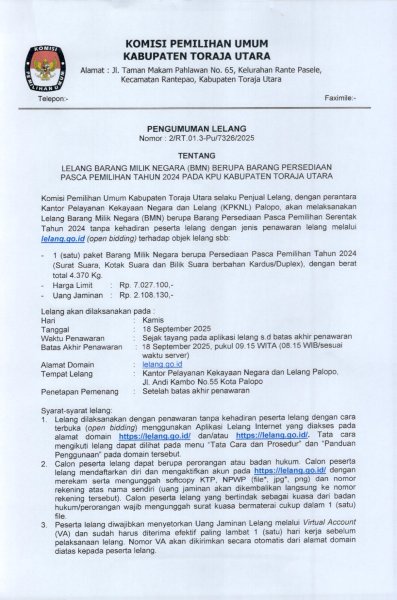 Rantepao, kab-torajautara.kpu.go.id- KPU Kabupaten Toraja Utara selaku Penjual Lelang dengan perantara Kantor Pelayanan Kekayaan Negara dan Lelang (KPKNL) Palopo akan melaksanakan Lelang Barang Milik Negara (BMN) berupa Barang Persediaan Pasca Pemilihan Serentak Tahun 2024. Lelang dilaksanakan tanpa kehadiran peserta lelang dengan penawaran melalui Aplikasi Lelang lelang.go.id (open bidding) terhadap objek lelang: “1 (satu) Paket Barang Milik Negara berupa Persediaan Pasca Pemilihan Serentak Tahun 2024 (Surat Suara, Kotak Suara dan Bilik Suara berbahan Kardus/Duplex), dengan berat total 4.370 Kg pada Komisi Pemilihan Umum Kabupaten Toraja Utara”. JADWAL DAN SYARAT LELANG Selengkapnya KLIK DI SINI (Tim Humas Torut) ....