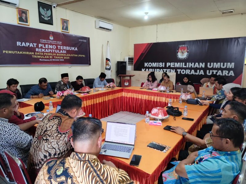 Rantepao, kab-torajautara.kpu.go.id- Kamis (02/10/2025), Komisi Pemilihan Umum Kabupaten Toraja Utara menggelar Rapat Pleno Rekapitulasi Pemutakhiran Data Pemilih Berkelanjutan Triwulan III Tahun 2025 di Aula Kantor KPU Kabupaten Toraja Utara yang dipimpin oleh Ketua KPU Kabupaten Toraja Utara, Jan Hery Pakan. Pemutakhiran Data Pemilih Berkelanjutan dilaksanakan berdasarkan Peraturan KPU Nomor 1 Tahun 2025 tentang Pemutakhiran Data Pemilih Berkelanjutan. Rapat Pleno dihadiri oleh Ketua dan Anggota Bawaslu Kabupaten Toraja Utara, Kasat Intel Polres Toraja Utara, Kodim 1414 Tana Toraja, Kemenag Toraja Utara, Kepala dinas Kependudukan dan Catan Sipil Kabupaten Toraja Utara, Kesbangpol Kabupaten Toraja Utara, DPML Kabupaten Toraja Utara, Badan Pusat Statistik Kabupaten Toraja Utara, BPJS Kesehatan Cabang Rantepao dan Media Pers. Hasil pleno menetapkan Rekapitulasi Daftar Pemilih Berkelanjutan Triwulan III Tahun 2025 yang dituangkan dalam Berita Acara Nomor 83/PK.01-BA/7326/2025 sebanyak 184.305 Pemilih terdiri dari 93.142 Pemilih laki-laki dan 91.163 Pemilih perempuan. SALINAN SK REKAPITULASI PDPB TRIWULAN III UNDUH DISINI (TIM HUMAS) ....