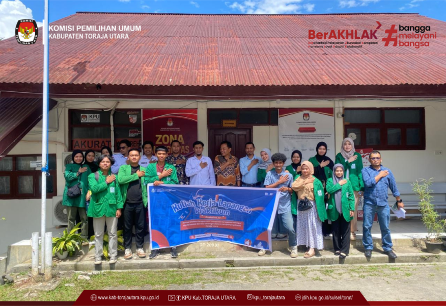 Rantepao, kab-torajautara.kpu.go.id-Sebanyak 14 mahasiswa Program Studi Ilmu Politik, Fakultas Ushuluddin dan Filsafat (FUF) UIN Alauddin Makassar melakukan kunjungan praktikum dan Kuliah Kerja Lapangan (KKL) di Kantor Komisi Pemilihan Umum (KPU) Kabupaten Toraja Utara. Pertemuan ini berlangsung khidmat di Aula Kantor KPU Kabupaten Toraja Utara pada Senin, 19 Januari 2026 Rombongan mahasiswa UIN ini dipimpin langsung oleh Kepala Laboratorium Ilmu Politik UIN Alauddin Makassar, Dr. M Syaipul, S.Sos., M.Si, Kehadiran mereka diterima secara resmi oleh Ketua beserta jajaran Anggota KPU Kabupaten Toraja Utara. Kunjungan ini mengangkat tema strategis: "Damai dalam Keberagaman: Moderasi Beragama Sebagai Modal Sosial dan Isu Strategis Dalam Kampanye Pilkada Toraja Utara". Kegiatan yang direncanakan berlangsung hingga 21 Januari 2026 ini bertujuan untuk memberikan wawasan praktis kepada mahasiswa mengenai dinamika politik lokal dan pelaksanaan tahapan Pilkada di Toraja Utara. Dalam sambutannya, Ketua KPU Kabupaten Toraja Utara, Jan Hery Pakan menjelaskan tentang latar belakang budaya dan politik yang ada di Toraja Utara. Pertemuan ini juga menjadi ajang diskusi dan pembelajaran terkait politik dan demokrasi, khususnya terkait keterwakilan dan partisipasi politik perempuan serta politik uang di Toraja Utara. Kuliah Kerja Lapangan dan Praktikum ini merupakan bagian penting dari kurikulum mahasiswa untuk memahami isu-isu strategis kampanye dan moderasi beragama dalam konteks demokrasi.Diharapkan melalui praktikum ini, para mahasiswa dapat mensinergikan teori yang didapat di bangku perkuliahan dengan realitas politik yang ada, khususnya di Kabupaten Toraja Utara. (TIM HUMAS) ....