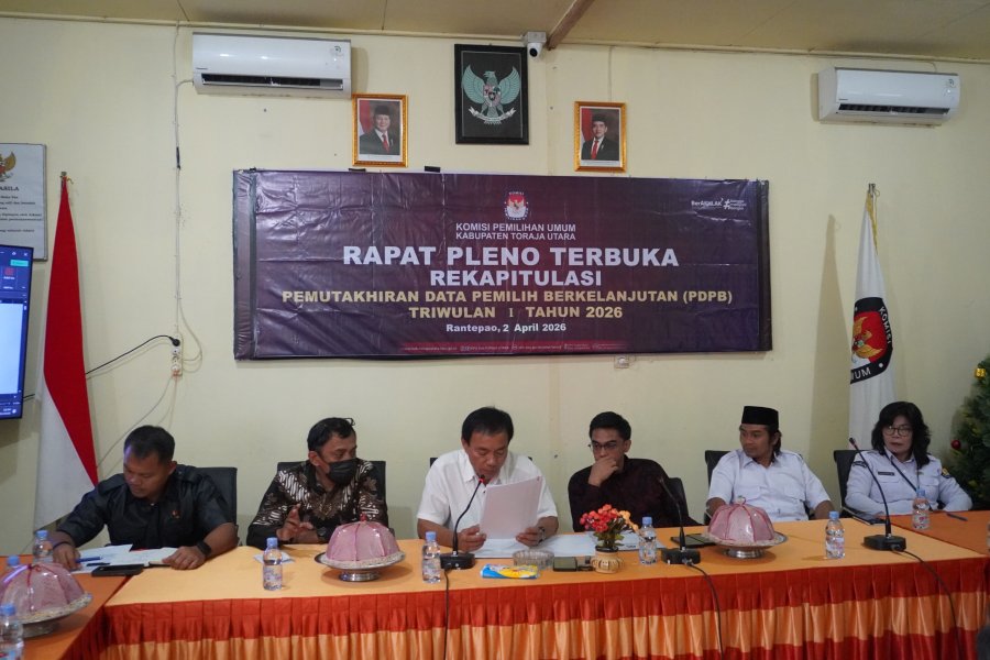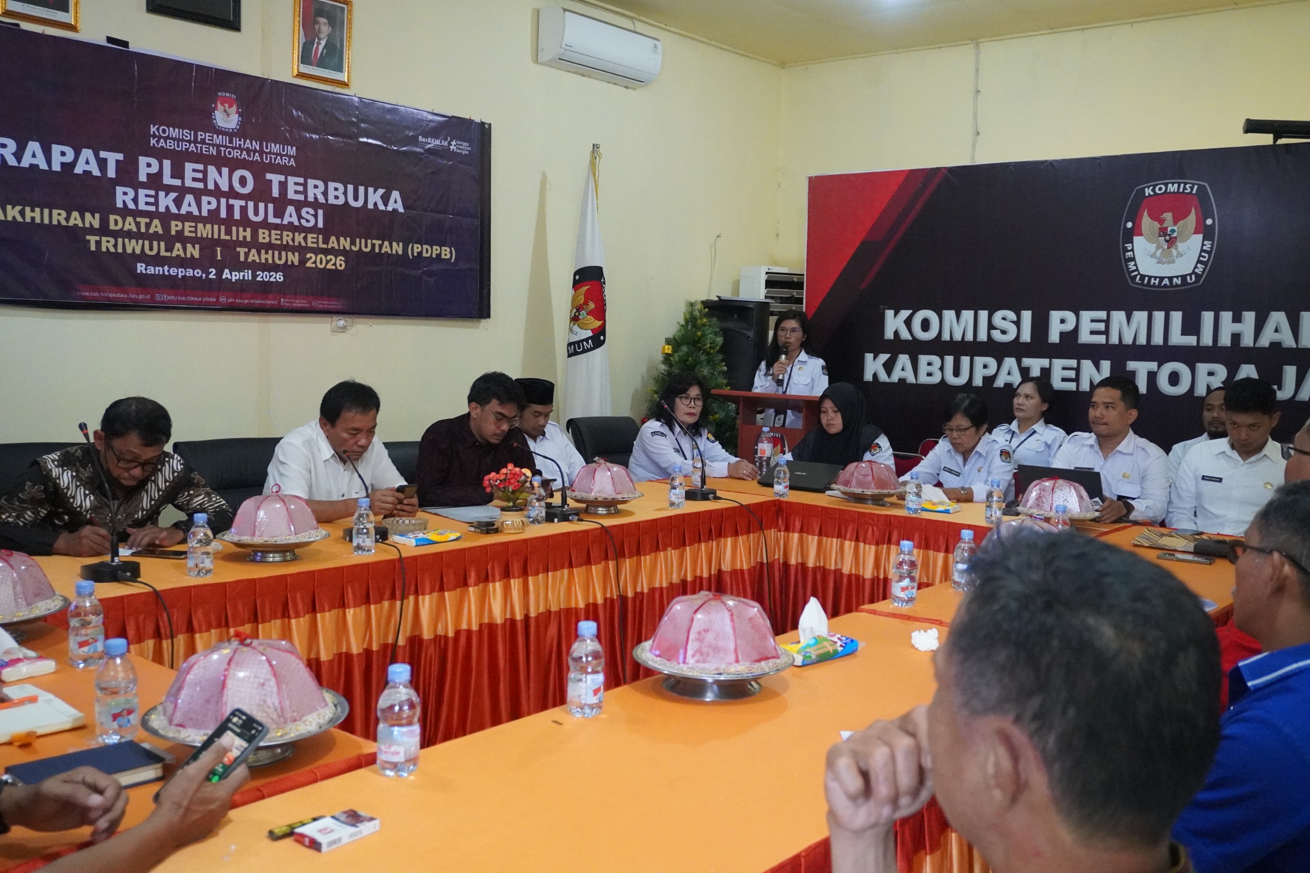 Rantepao, kab-torajautara.kpu.go.id- Kamis (02/04/2026), Komisi Pemilihan Umum Kabupaten Toraja Utara menggelar Rapat Pleno Rekapitulasi Pemutakhiran Data Pemilih Berkelanjutan Triwulan I Tahun 2026 di Aula Kantor KPU Kabupaten Toraja Utara yang dipimpin oleh Ketua KPU Kabupaten Toraja Utara, Jan Hery Pakan. Pemutakhiran Data Pemilih Berkelanjutan dilaksanakan berdasarkan Peraturan KPU Nomor 1 Tahun 2025 tentang Pemutakhiran Data Pemilih Berkelanjutan.