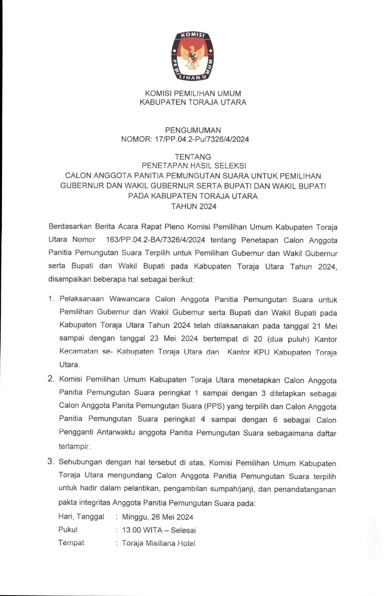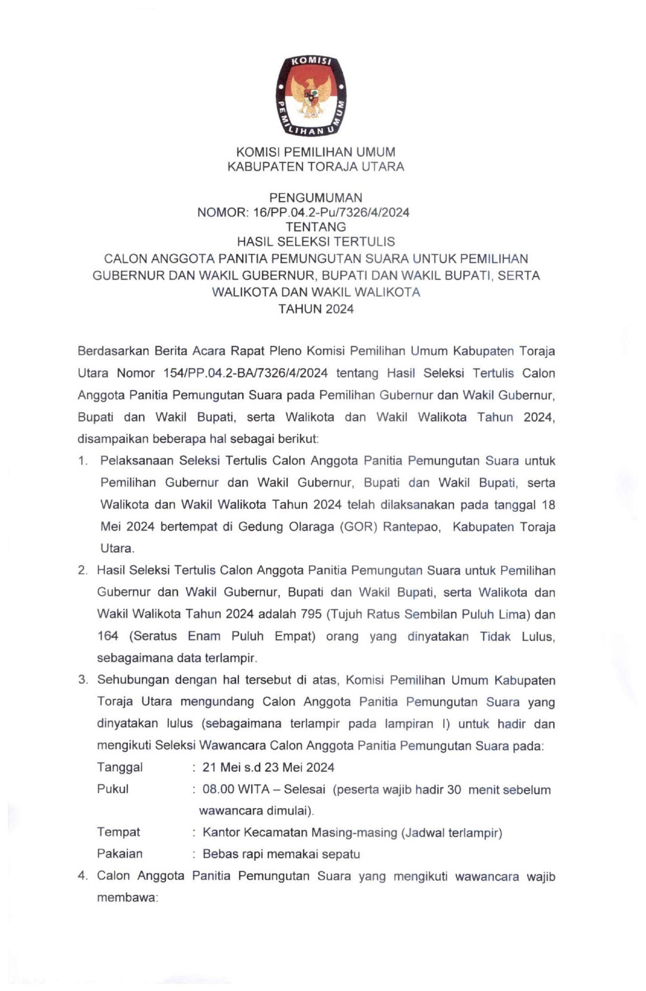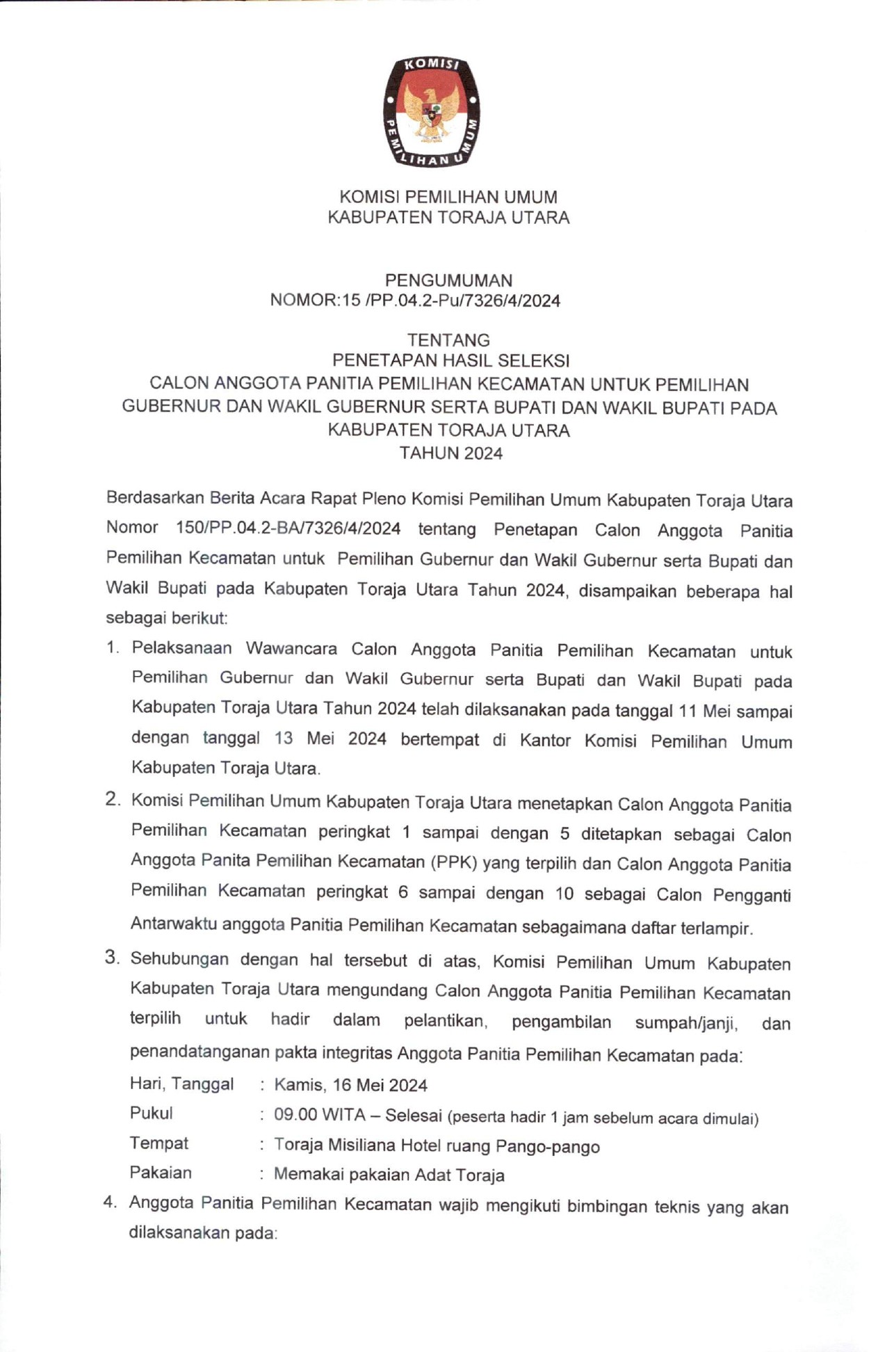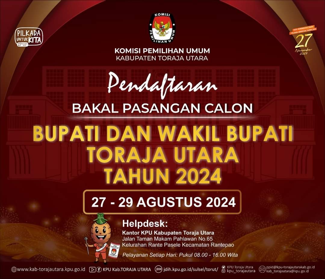 Rantepao, kab-torajautara.kpu.go.id- Komisi Pemilihan Umum Kabupaten Toraja Utara menerima Masukan dan Tanggapan Masyarakat terhadap Pasangan Calon Bupati dan Wakil Bupati pada Pemilihan Bupati dan Wakil Bupati Toraja Utara pada tanggal 15 – 18 September 2024 melalui Portal Publikasi Pemilu dan Pemilihan pada laman: https://infopemilu.kpu.go.id atau datang langsung ke Kantor KPU Kabupaten Toraja Utara, Jalan Taman Makam Pahlawan Nomor 65 Rante Pasele, Kecamatan Rantepao, Kabupaten Toraja Utara.