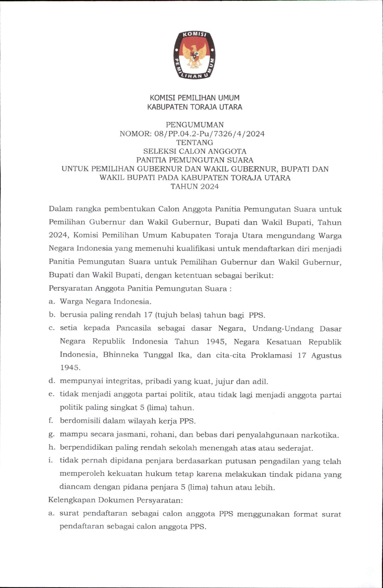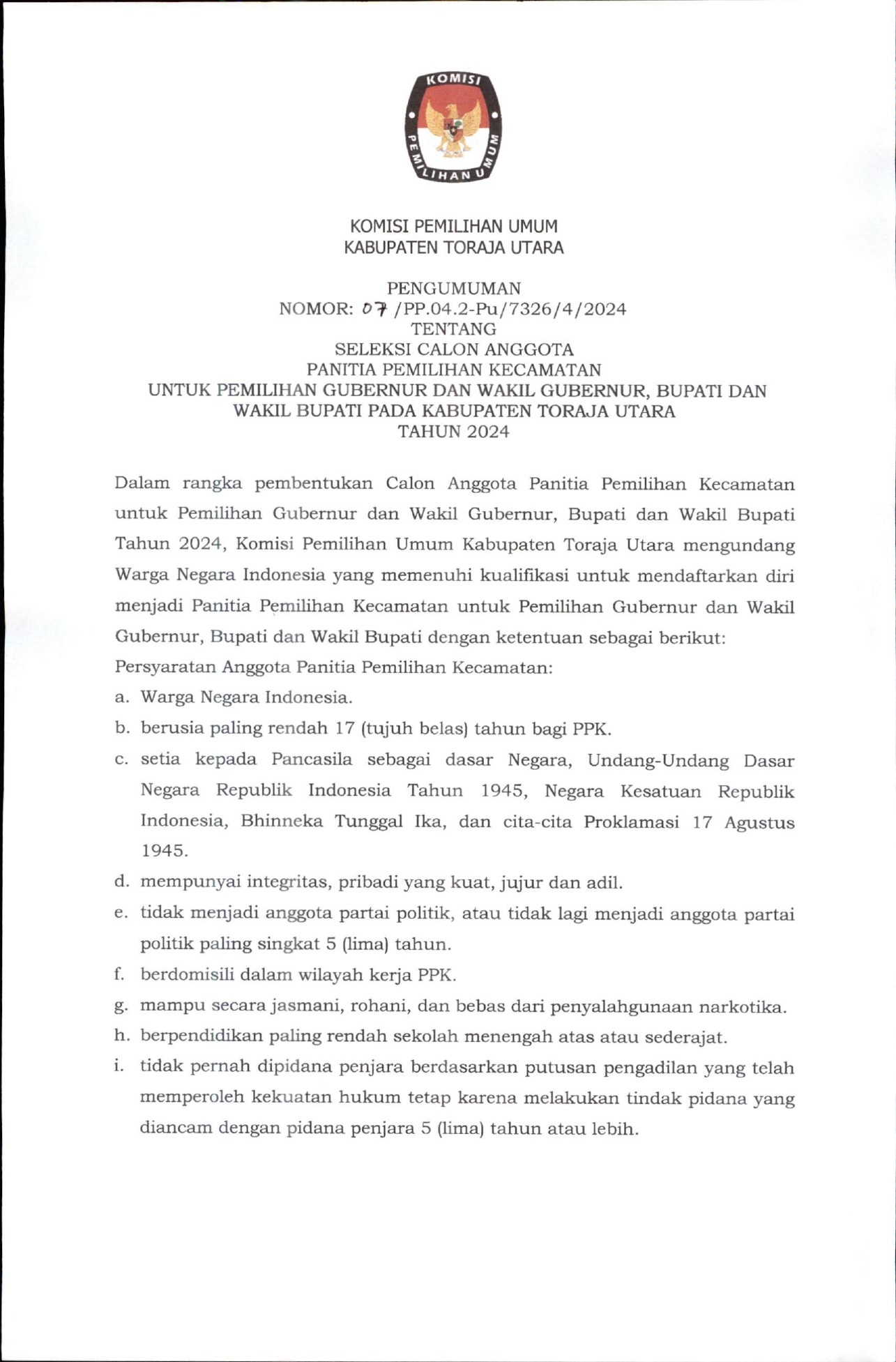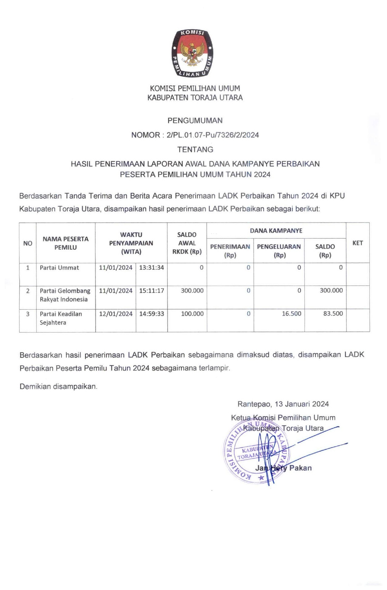 Rantepao, kab-torajautara.kpu.go.id- Senin (4/3/2024) KPU Kabupaten Toraja mengumumkan Rekapitulasi Hasil Penghitungan Perolehan Suara Pemilu Presiden dan Wakil Presiden, Anggota DPR, DPD, DPRD Provinsi dan DPRD Kabupaten setelah Rekapitulasi Hasil Penghitungan Perolehan Suara selesai. KPU Kabupaten Toraja Utara juga menetapkan Hasil Pemilihan Umum Anggota DPRD Kabupaten Toraja Utara Tahun 2024 melalui Keputusan Komisi Pemilihan Umum Kabupaten Toraja Utara Nomor 508 Tahun 2024 tentang Penetapan Hasil Pemilihan Umum Anggota Dewan Perwakilan Rakyat Daerah Kabupaten Toraja Utara.