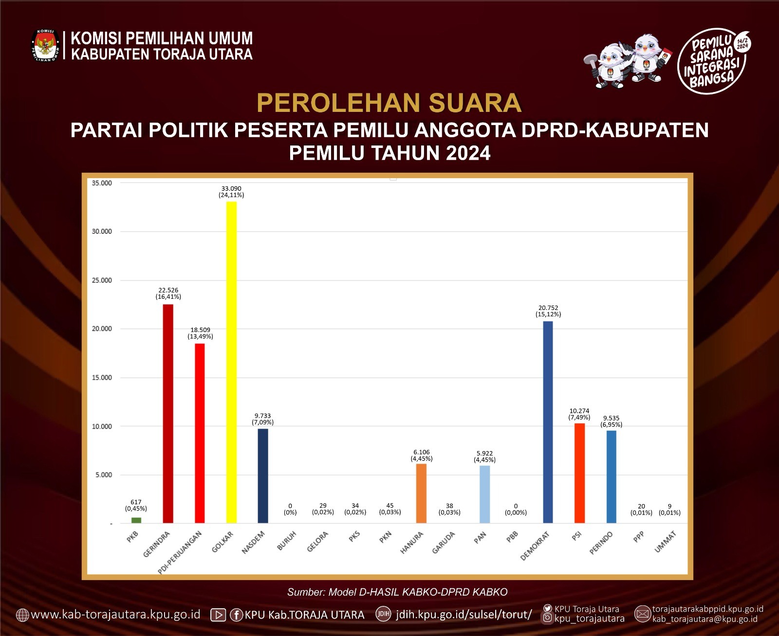Perolehan Suara Sah Partai Politik dan Perolehan Suara Sah serta Peringkat Suara Sah Calon Anggota DPRD Kabupaten Toraja Utara setiap Partai Politik Selengkapnya KLIK DI SINI