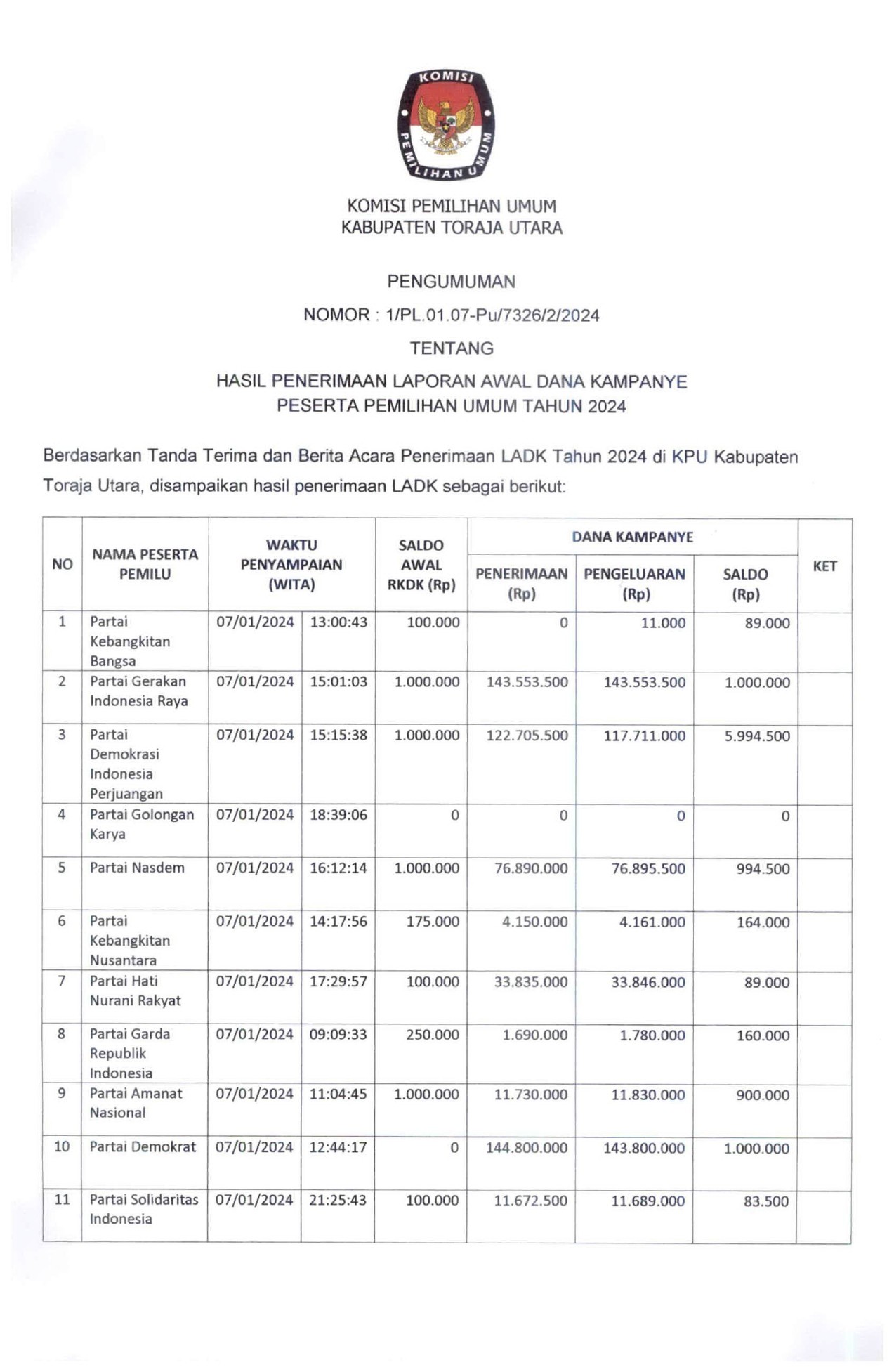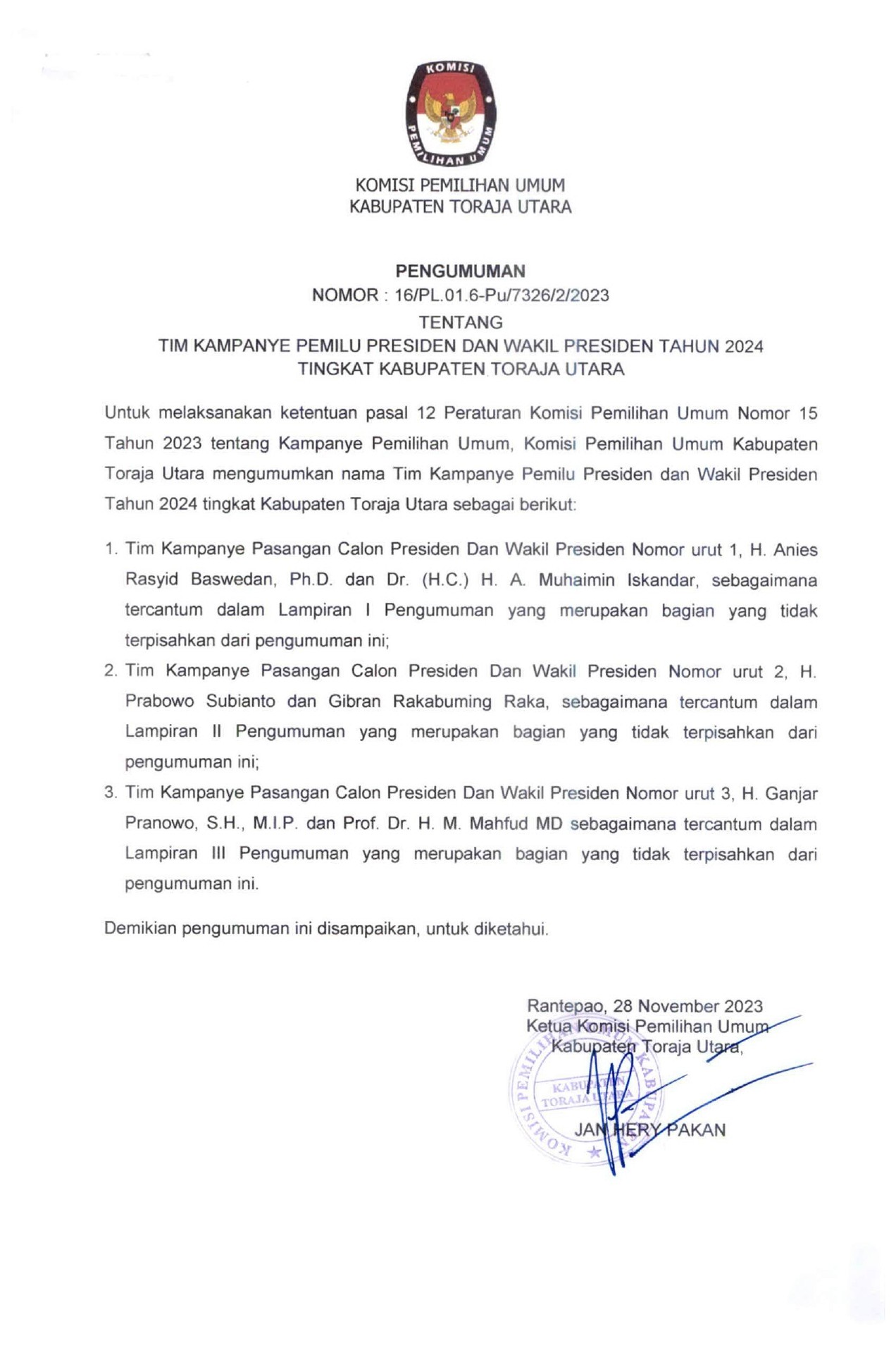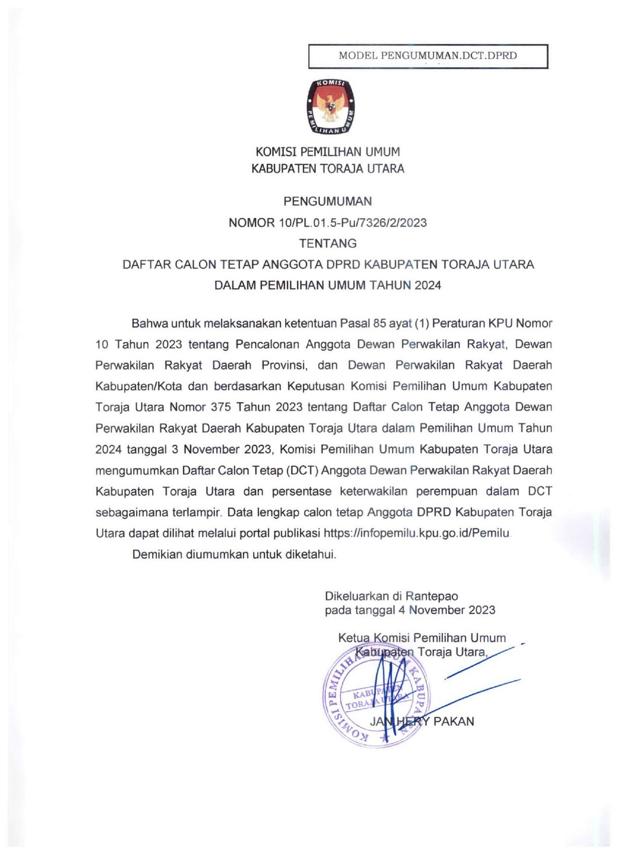 Rantepao, kab-torajautara.kpu.go.id- Pengumuman Nomor 18/PP.04.1-Pu/7326/4/2023 tentang Hasil Penelitian Administrasi Calon Anggota Kelompok Penyelenggara Pemungutan Suara Untuk Pemilihan Umum Tahun 2024 Se-Kabupaten Toraja Utara.