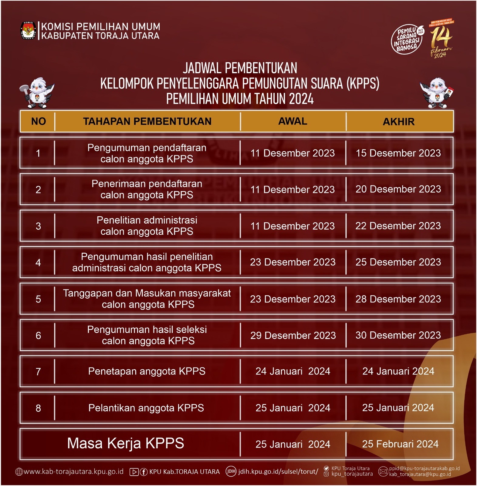 Masyarakat dapat menyampaikan tanggapan dan masukan masyarakat terhadap Calon Anggota KPPS sejak tanggal 23 Desember 2023 sampai dengan 28 Desember 2023 dan disampaikan kepada PPS Kelurahan/Lembang.