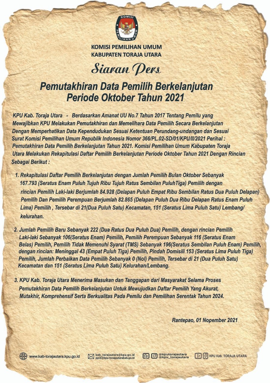 Jenis tanggapan/masukan yaitu terkait penambahan pemilih, pengurangan pemilih, serta perbaikan elemen data pemilih. Penambahan pemilih diperkenankan untuk pemilih pemula yang baru cukup umur (17 tahun) dan sudah melakukan perekaman KTP-el, pensiunan TNI atau Polri, atau baru pindah dari luar Toraja Utara. Pengurangan pemilih dilakukan untuk pemilih yang tidak memenuhi syarat seperti meninggal dunia, pindah keluar dari Toraja Utara, tidak dikenal, menjadi Anggota TNI atau Polri, bukan penduduk Toraja Utara, dicabut hak pilihnya oleh pengadilan, belum memiliki KTP-el/suket, ganda, atau belum cukup umur. Perbaikan elemen data pemilih dapat dilakukan jika terdapat elemen data yang keliru. Pemberian tanggapan/masukan dapat dilakukan secara daring melalui link bit.ly/FormPDPB2022 atau melalui Aplikasi Lindungi Hakmu yang dapat diunduh DI SINI. Selain itu, pemberian tanggapan/masukan dapat dilakukan dengan datang langsung ke Kantor KPU Kabupaten Toraja Utara, Jl.Taman Makam Pahlawan No.65 Rantepao dengan memperhatikan protokol kesehatan. (Humas KPU Torut)